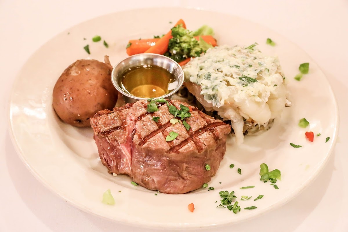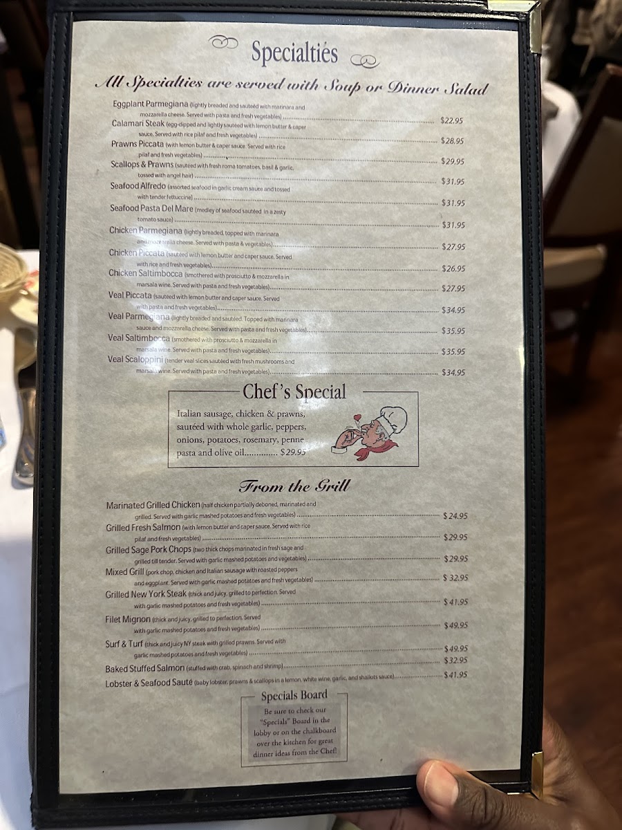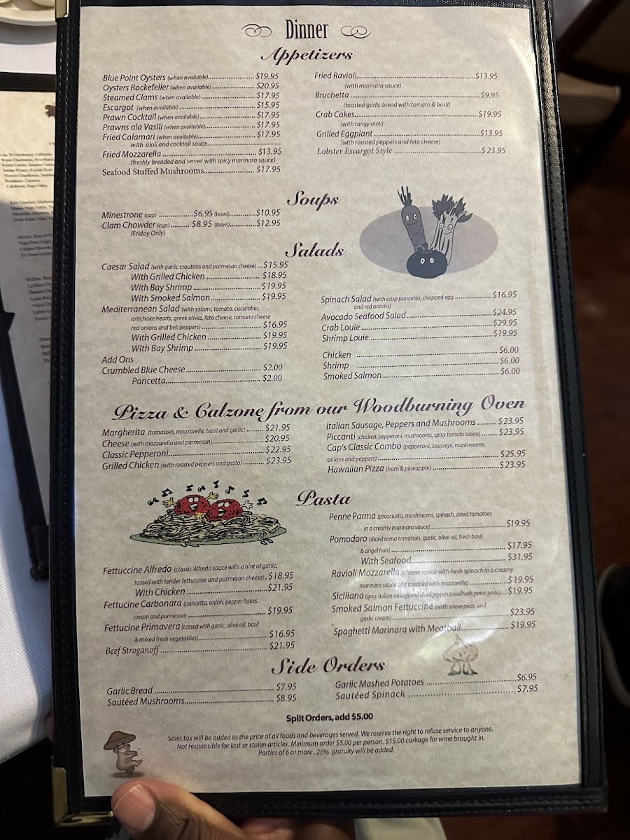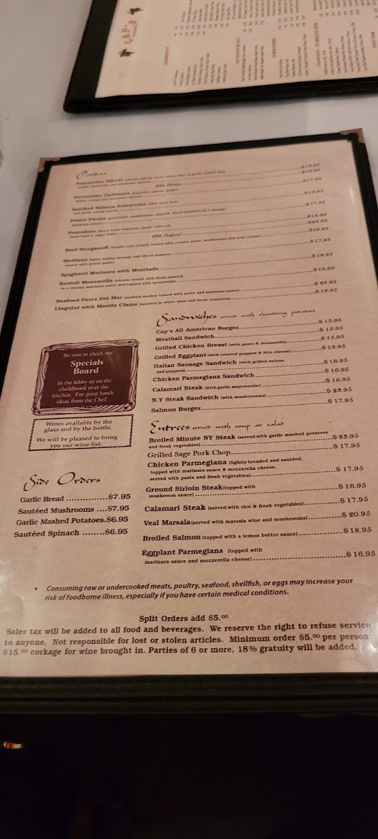 Cap's menu is a delightful offering, highlighting their specialties such as the sumptuous Filet Mignon & Australian Lobster priced at $75.95, an indulgent dish that harmonizes tender steak with the rich flavors of succulent lobster. The Roast Prime with Au Jus ($38.98) is another must-try, renowned for its juicy, melt-in-your-mouth quality. For those looking for something unique, the Broiled Elk Chop with Diane Sauce ($34.98) delivers a remarkable flavor profile that’s sure to impress adventurous palettes.